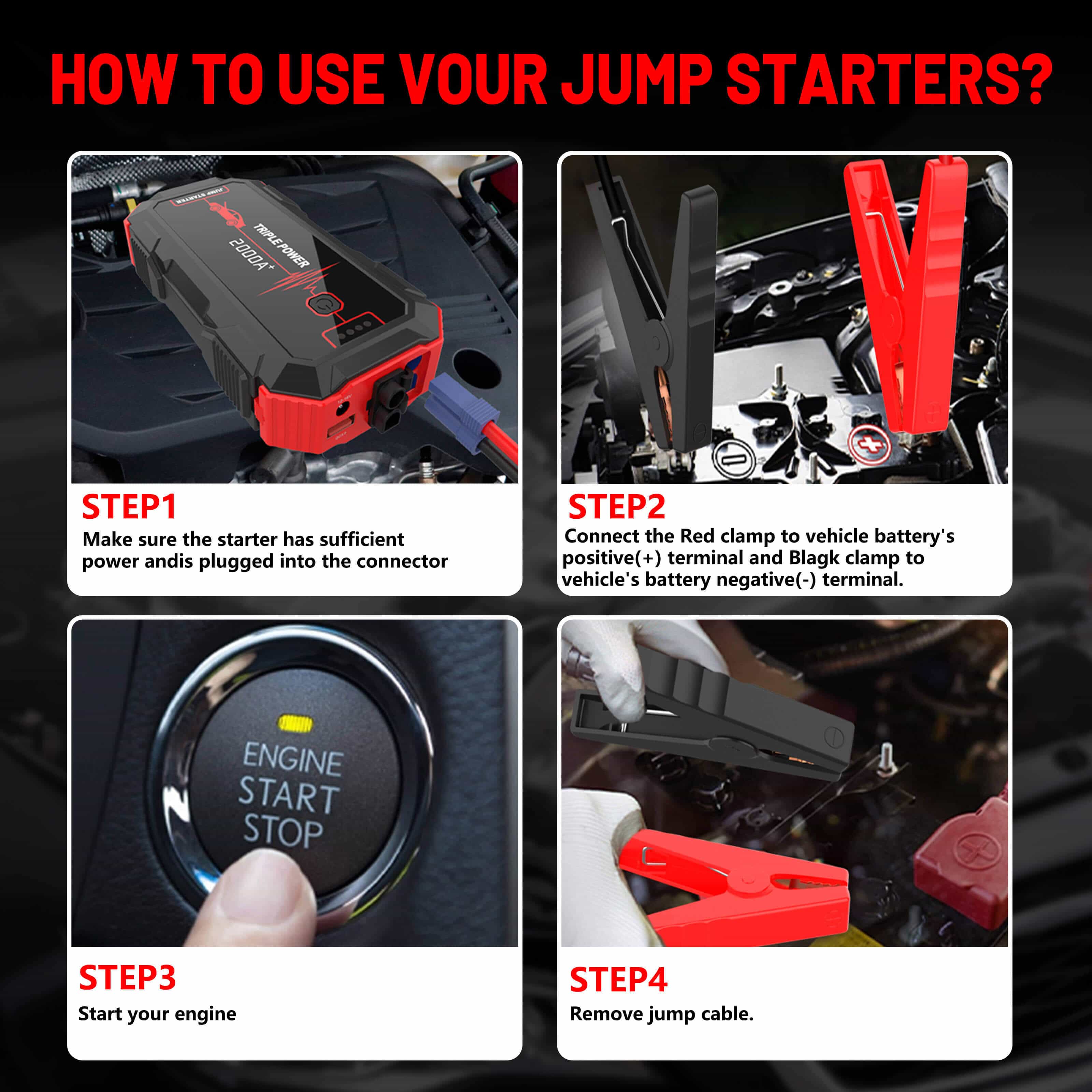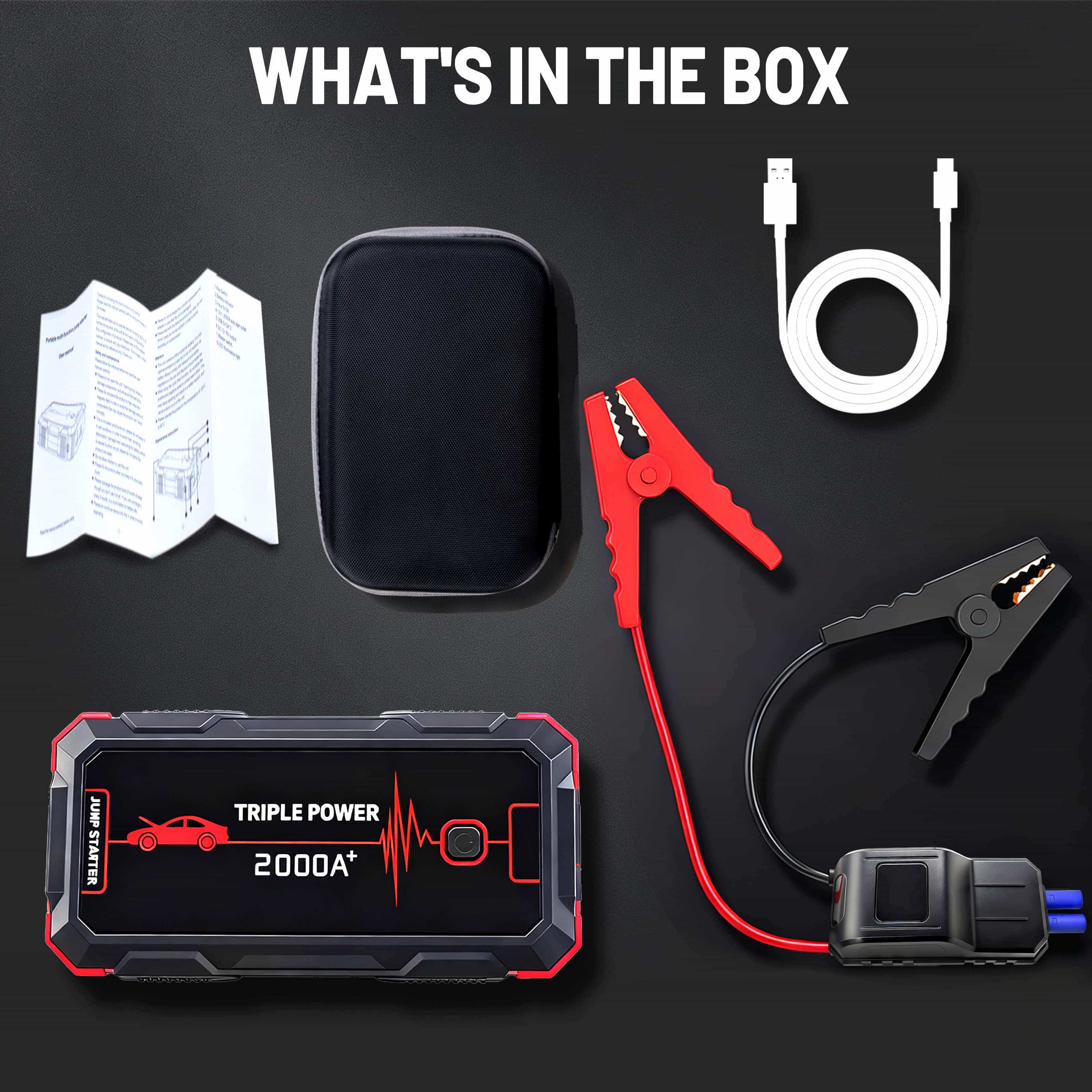 Powerful 2000 amp jump starter starts 10.0L gas and 10.0L diesel engines.