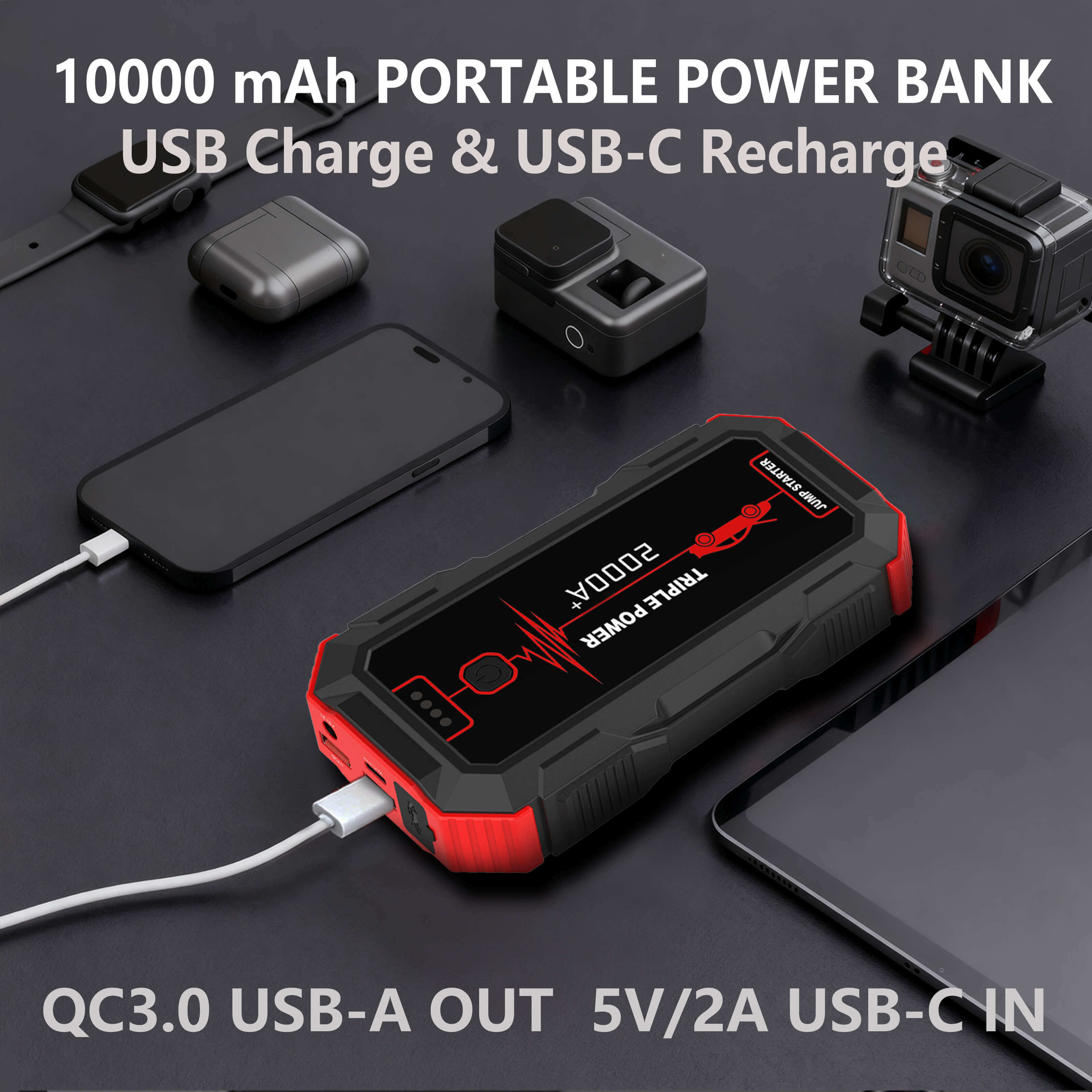 Emergency car jump starter with power bank built-in 10000mAh power bank charges phones, tablets, and laptops on the go.